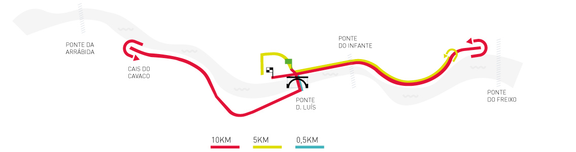 Corrida 10km – Partida na Av. Gustavo Eiffel (junto à ponte D.Luís), atravessa o Rio Douro no tabuleiro inferior da ponte D.Luís, Av. Diogo Leite, Av. Ramos Pinto, Cais de Gaia, Cais Fontainha, Cais Capelo Ivens, Cais Cavaco faz o Retorno junto a Velha Grua, efetuando o mesmo percurso até ao tabuleiro inferior da ponte D.Luís, segue pela Av. Paiva Couceiro e o retorno faz-se antes da ponte do Freixo regressando pelo mesmo percurso até à Av. Gustavo Eiffel.